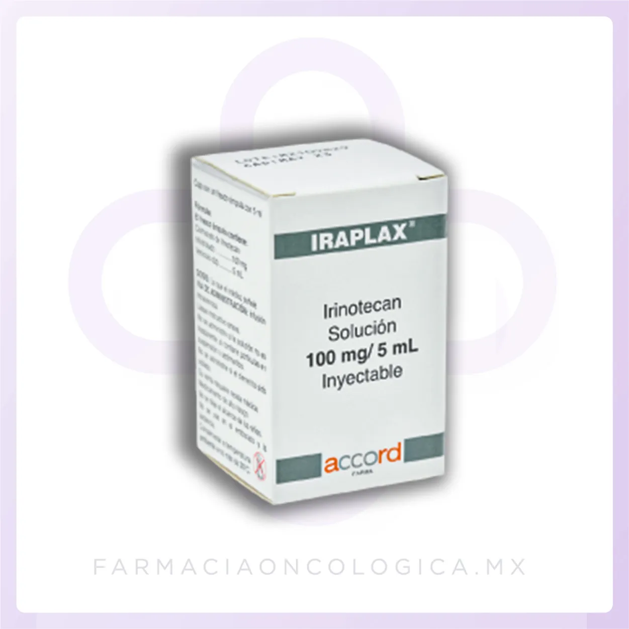 Iraplax Irinotecán 100 mg/5 mL es un medicamento de alta especialidad utilizado en el tratamiento de cáncer colorrectal metastásico, especialmente en pacientes que han fallado a tratamientos previos con fluorouracilo. Irinotecán es un inhibidor de la enzima topoisomerasa I, esencial para la replicación del ADN. Al bloquear esta enzima, se induce daño en el ADN de las células tumorales, provocando su muerte. Se administra por vía intravenosa y forma parte de esquemas como FOLFIRI, en combinación con leucovorina y fluorouracilo.