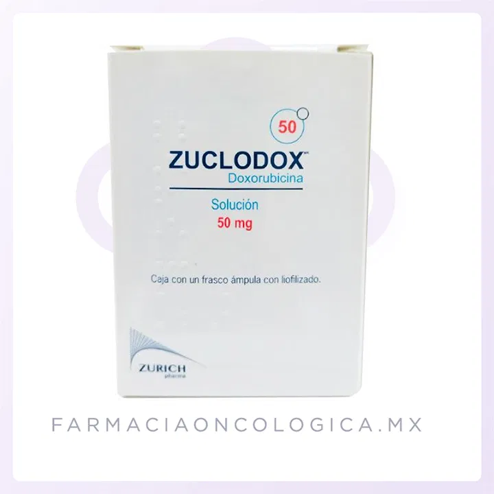 Zuclodox Doxorubicina 50 mg es un medicamento de alta especialidad utilizado en el tratamiento de cáncer de mama, cáncer de pulmón, leucemia linfoblástica aguda, leucemia mieloide aguda, linfoma de Hodgkin y no Hodgkin, sarcomas de tejidos blandos, entre otros. Doxorubicina actúa intercalándose en el ADN y generando radicales libres que dañan las células tumorales, inhibiendo su proliferación. Es una de las quimioterapias más utilizadas en protocolos combinados.